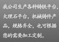 全意鑄鐵平臺(tái)平板廠家專注生產(chǎn)T型槽鑄鐵平臺(tái),大理石氣浮實(shí)驗(yàn)石平臺(tái),han接鑄鐵平臺(tái),裝配鑄鐵平臺(tái),檢測(cè)測(cè)量大理石平臺(tái),試驗(yàn)鑄鐵平臺(tái),測(cè)量大理石平板,T型槽平臺(tái),電機(jī)試驗(yàn)平臺(tái),三坐標(biāo)測(cè)量平臺(tái)等鑄鐵平板來(lái)圖加工定做業(yè)務(wù),以合理的價(jià)格,專注的技術(shù)服務(wù)于國(guó)內(nèi)外客戶,互利合作,共同發(fā)展!公司位于河北交河開(kāi)發(fā)區(qū),京滬鐵路、104國(guó)道、106國(guó)道、京福高速公路橫穿而過(guò),與我國(guó)的兩大直轄市北京、天津近在咫尺,地理位置優(yōu)越,交通非常便利。我公司本著以誠(chéng)納客”“嚴(yán)把質(zhì)量關(guān)”“價(jià)格優(yōu)惠”“用戶至上的原則,幾十年兢兢業(yè)業(yè),受到用戶的一致好評(píng)!